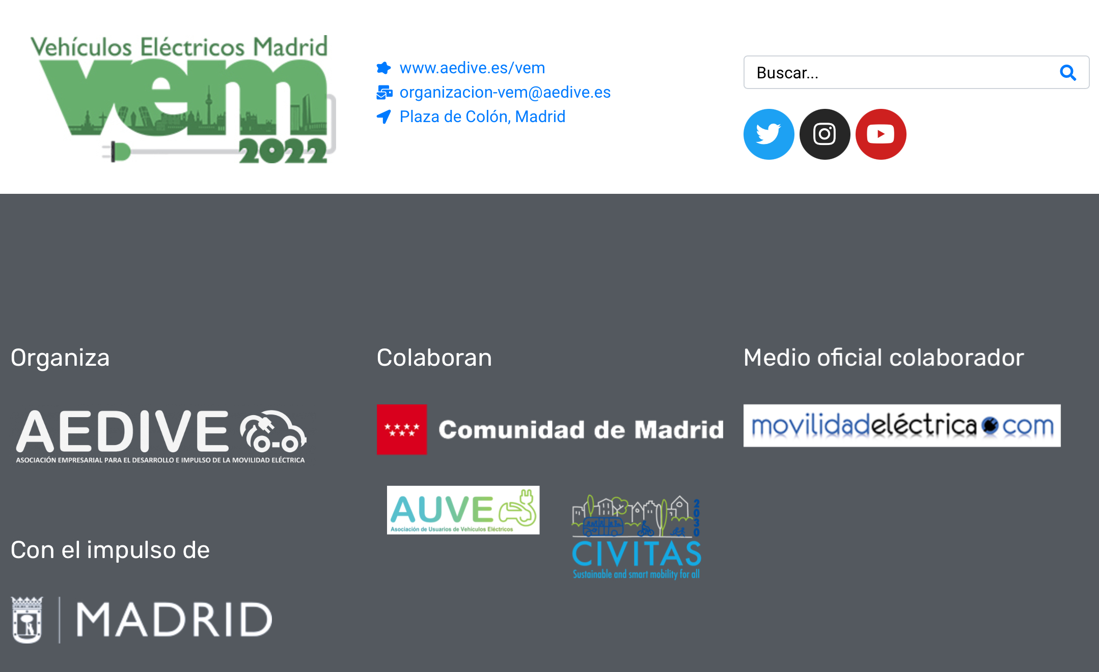 Nuestra asociación AUVE (Asociación de Usuarios de Vehículos Eléctricos) participará en el evento VEM2022 (Vehículo Eléctrico Madrid), su séptima edición de una exposición y prueba de vehículos eléctricos dirigido a la ciudadanía madrileña. El fin principal del VEM 2022, que se celebra en Plaza de Colón de Madrid los días 16, 17, y 18 de septiembre, es acercar la movilidad cero emisiones tanto al particular como al profesional (flotas) público y privado.
