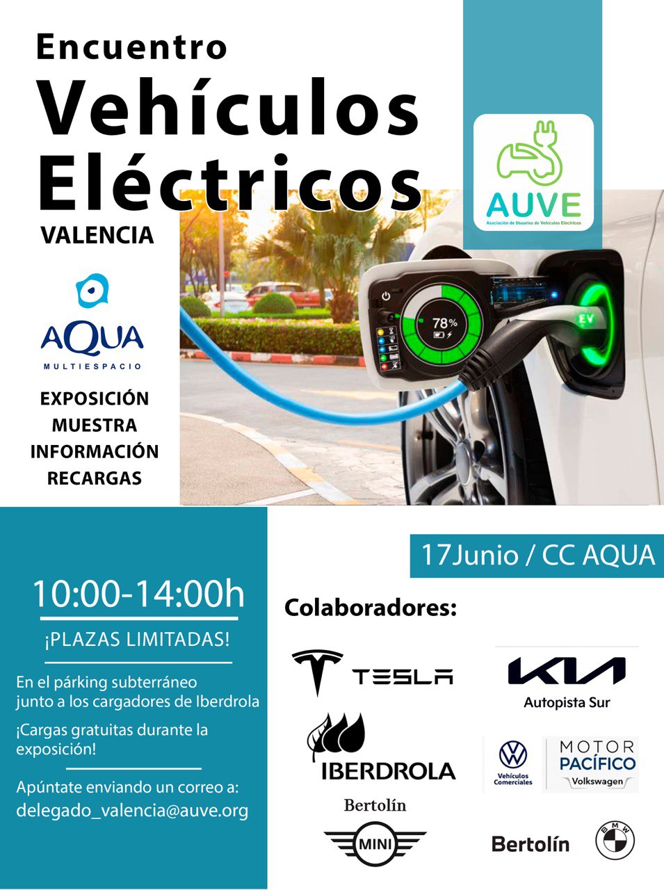 Os esperamos el sábado día 17 de Junio en el parking subterráneo del Centro Comercial AQUA en Valencia junto a la zona de cargadores de Iberdrola, Habrá exposición de vehículos propios y de marcas como Tesla, Volkswagen, Kia, BMW, Mini, así como regalos para los asistentes, sorpresas, etc.