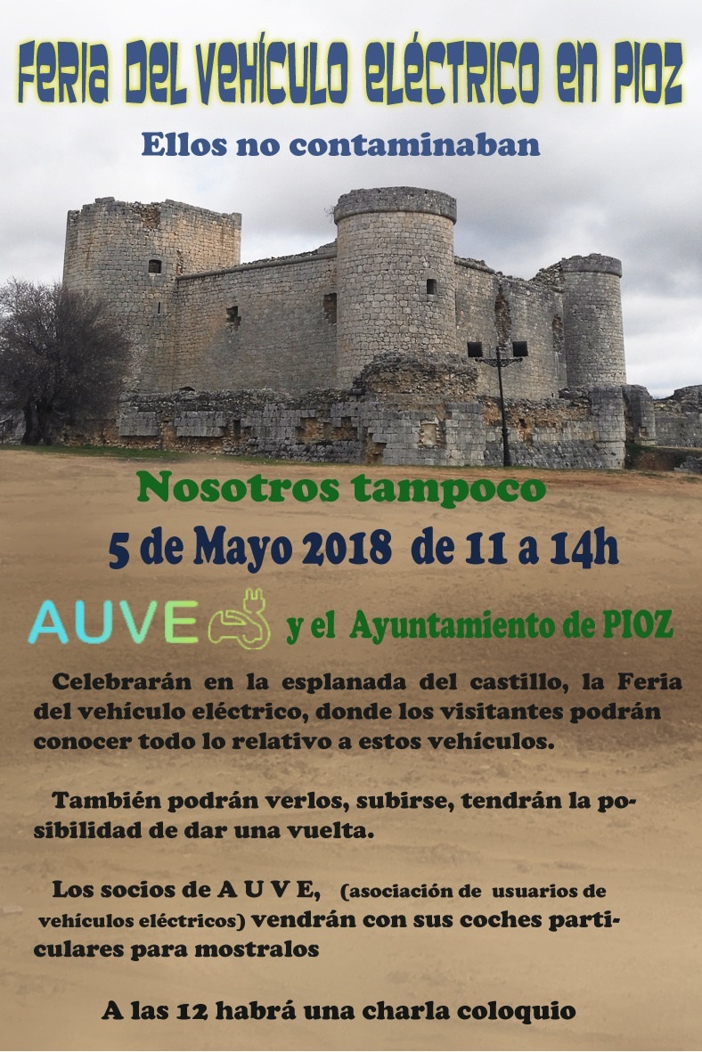 EL día 5 de Mayo se celebró de nuevo otra feria del vehículo eléctrico, esta vez en la localidad de Pioz (Guadalajara), desde el primer momento el ayuntamiento colaboró en facilitarnos un espacio destinado al evento e incluso tomas para poder cargar nuestros vehículos, incluso se hizo carga de la cartelería para promocionar el evento.