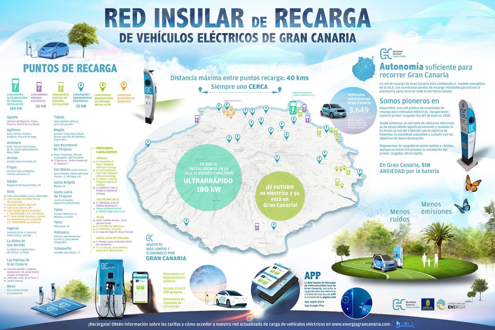 La red insular de recarga es un proyecto cuya génesis se puede situar hace casi un lustro, en el momento en que desde el Cabildo se apostó por facilitar la penetración de la movilidad sostenible en Gran Canaria y se buscó el asesoramiento de la AUVE Las Palmas, muy activos desde un principio a la hora de nuclear a usuarios y profesionales. Rápidamente, la idea de la red insular se plasmaría a través de un proyecto encargado al ingeniero Celso Rodríguez que buscaba dar asistencia a los vehículos en la vía pública, de manera que no hubiese más de 42 km de distancia entre un punto de recarga y otro.