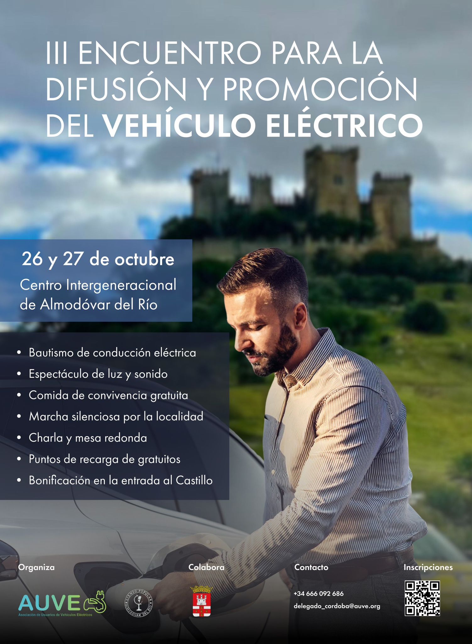 Los próximos días 26 y 27 de octubre se celebrará el III Encuentro para la Difusión y Promoción del Vehículo Eléctrico en Almodóvar del Río. Ante el éxito que tuvo la convocatoria celebrada en años anteriores, la delegación en Córdoba de la Asociación de Usuarios de Vehículos Eléctricos (AUVE) y el Ateneo Popular de Almodóvar del Río han decidido volver a convocar a los propietarios de estos silenciosos vehículos en una nueva edición, en la que también colabora el Ayuntamiento de Almodóvar, como ya ocurriera el año pasado.