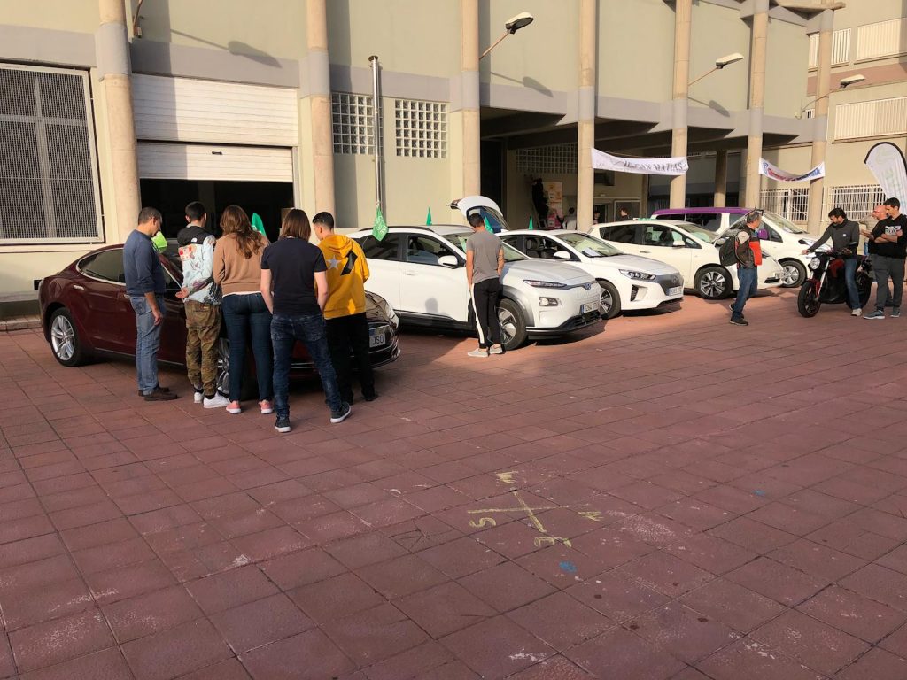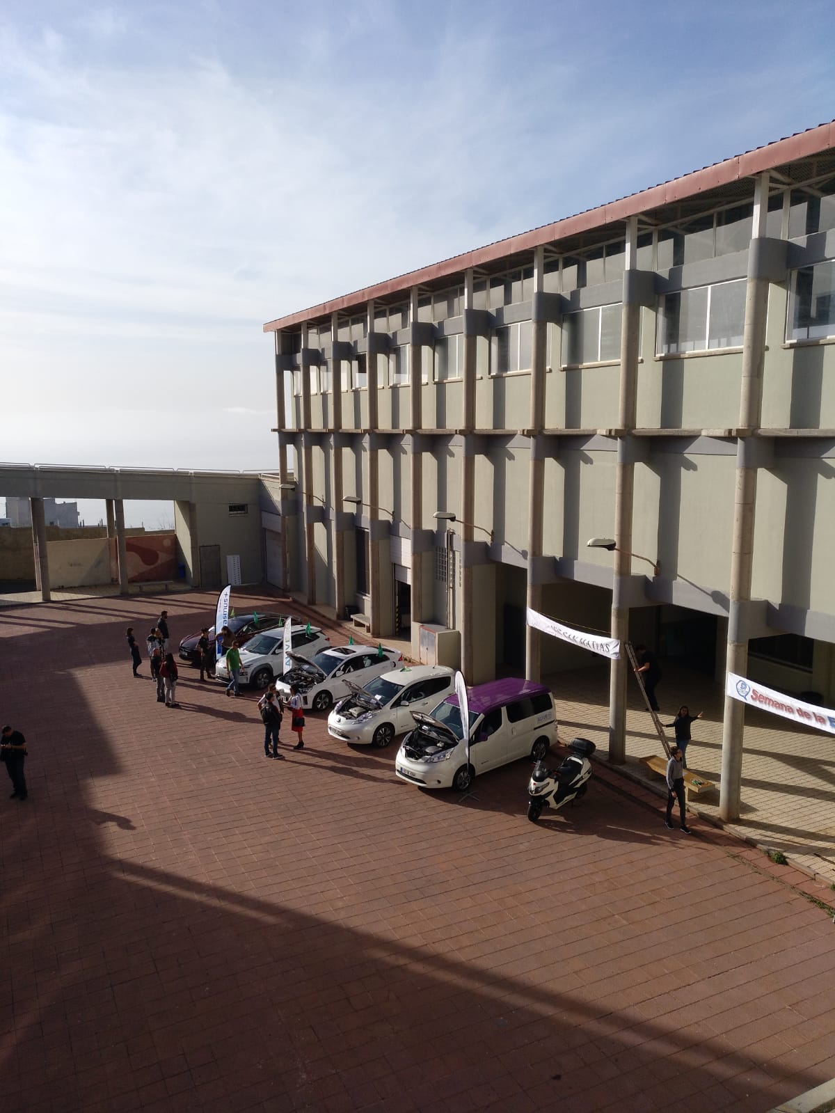 Luego se pasó al patio donde estaban los vehículos cedidos por los socios de AUVE, estaban expuestos: un Tesla Model S P85 Performance Signature, pasando por los Hyundai Ioniq y Kona, el Nissan Leaf , la Nissan E-Nv200 Evalia de nueva generación cedida por Limpiezas Apeles y las motocicletas Zero y Lem. El alumnado y profesorado que se acercaron a los vehículos no dudaron en preguntar y ojear los vehículos llegando incluso a tener la posibilidad de dar pequeñas vueltas dentro de los coches, también visitó el recinto RTVC grabando imágenes y filmando como Tomas Gómez explicaba a los chicos y chicas el funcionamiento de un coche eléctrico. También los ponentes tuvieron la ocasión de ver las aulas donde se impartían las clases de Energías Renovables y las instalaciones donde se hacían las prácticas de instalación de las placas fotovoltaicas y térmicas.