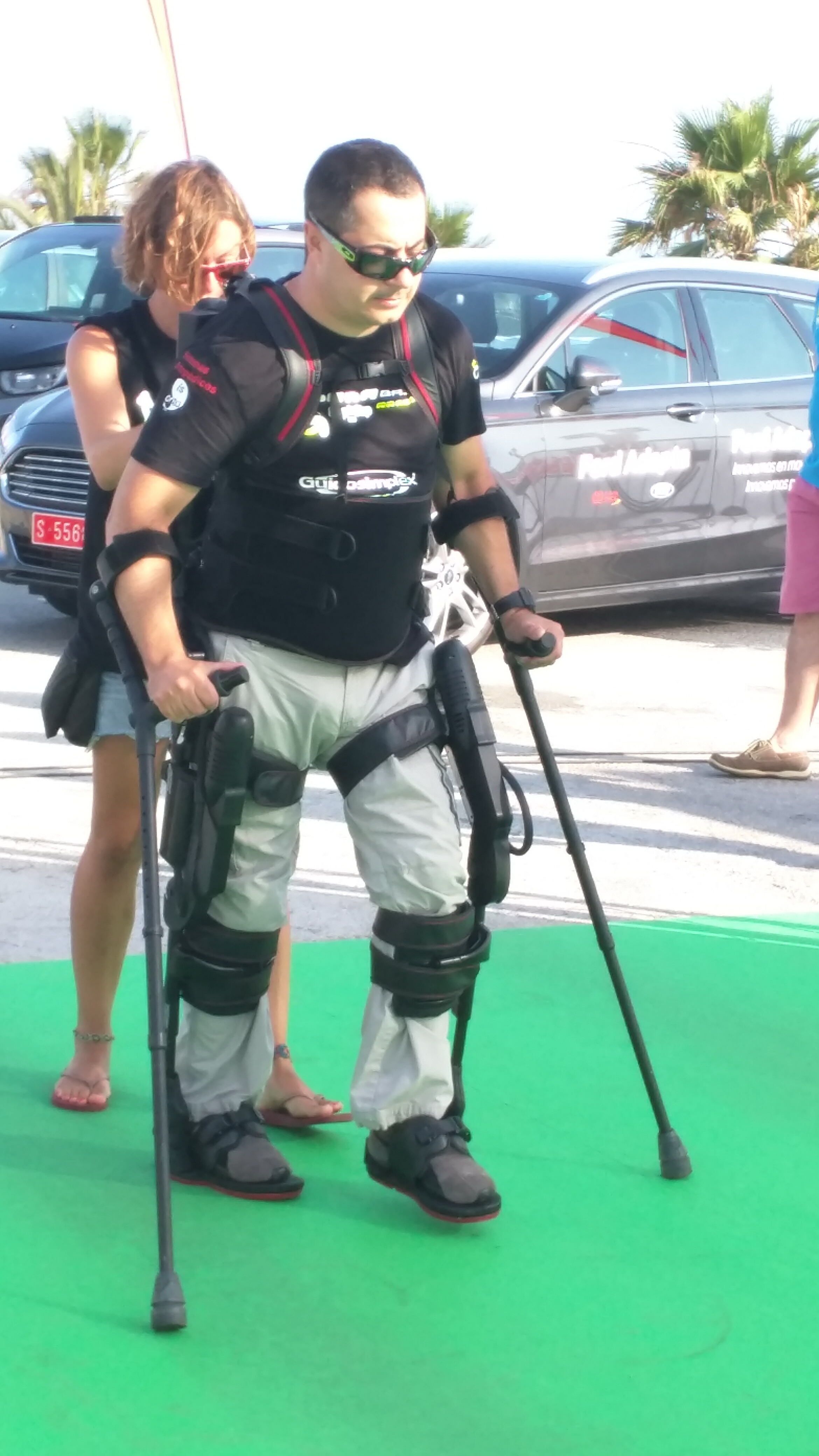 Me explicó que durante toda la tarde, y mientras transcurría la prueba, se montarían actividades de todo tipo para que los asistentes pudieran ver y probar todo tipo de aparatos para discapacitados y así tener la oportunidad de experimentar las dificultades que se encuentran y retos que ha de superar este colectivo. Se organizarían yincanas de todo tipo y ejercicios de habilidades de perros guía y de apoyo. También habrían diferentes tipos de sillas manuales y motorizadas y hasta un esqueleto robotizado, que permitía a una persona sin movilidad en las piernas, poder erguirse y caminar con la ayuda de este aparato y unas muletas.