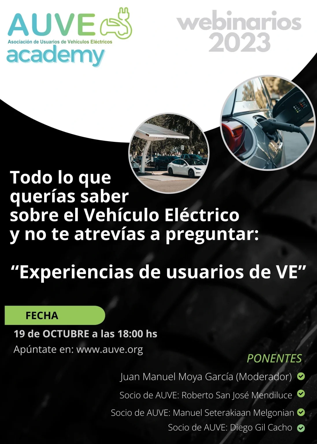 La Asociación de Usuarios de Vehículos Eléctricos (AUVE) se enorgullece en presentar AUVE Academy, un proyecto con la misión de educar y difundir información acerca de la movilidad eléctrica y sostenible. En su fase piloto actual, se ha enfocado en proporcionar información y conocimientos fundamentales para aquellos que muestran interés en el mundo de los Vehículos Eléctricos y su entorno. Este programa busca facilitar a los participantes una comprensión completa y actualizada de los beneficios y desafíos de esta forma de movilidad, promoviendo así un mayor entendimiento y adopción de esta tecnología innovadora y sostenible.En esta primera fase, la asociación ha organizado una serie de seis webinarios centrados en el Vehículo Eléctrico. Se espera la participación de fabricantes de vehículos, empresas especializadas en sostenibilidad y desarrolladores de sistemas de carga. Además, se contará con las experiencias y perspectivas valiosas de los miembros de AUVE, lo que sin duda enriquecerá la formación.El primer webinario de esta serie lleva por título "Todo lo que querías saber sobre el Vehículo Eléctrico y no te has atrevido a preguntar: Experiencias propias de usuarios de VE".Este evento contará con tres ponentes socios de AUVE: Roberto San José Mendiluce uno de los primeros taxistas con vehículo eléctrico en España, Manuel Seterakiaan Melgonian y Diego Gil Cacho. Juan Manuel Moya García, embajador de AUVE, actuará como moderador del webinario.